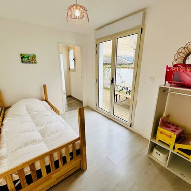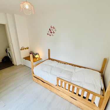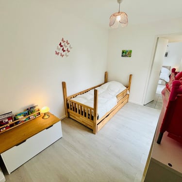 - un espace nuit en enfilade avec une première chambre esprit enfant avec un lit simple (90cm) puis une salle de douche et enfin une seconde chambre équipée d’un lit double (140cm).