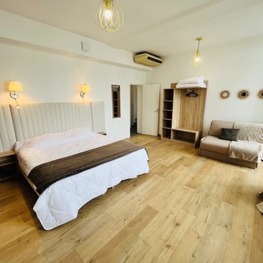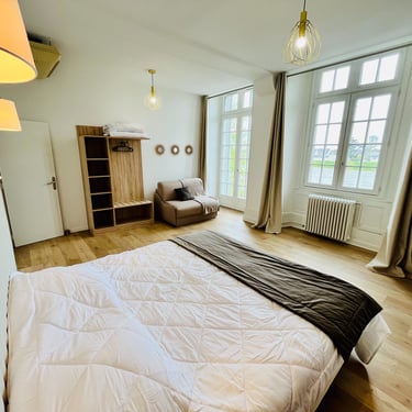 - Une chambre avec lit kig size et un canapé d'appoint pouvant recevoir une personne, vue directe sur la Loire.