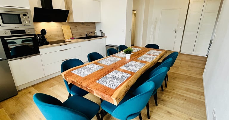 Un bel espace dinatoire est à votre disposition. Il est composé d'une table en bois brut, avec un piètement industriel, et de chaises contemporaines et confortables. Ici, vous pourrez recevoir vos convives avec élégance !