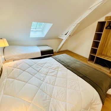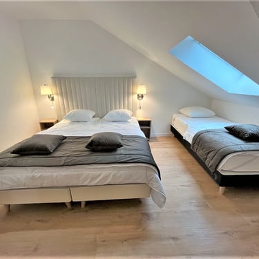 A l'étage, l'espace nuit est composé de trois chambres confortables :