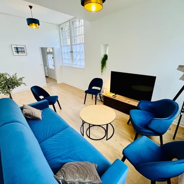 - Notre grand salon bénéficie de beaux volumes et sera le lieu parfait pour partager de jolis moments de convivialité avec votre famille ou vos amis. Il comprend un canapé, une table basse et deux fauteuils d'assise face à un écran plat.