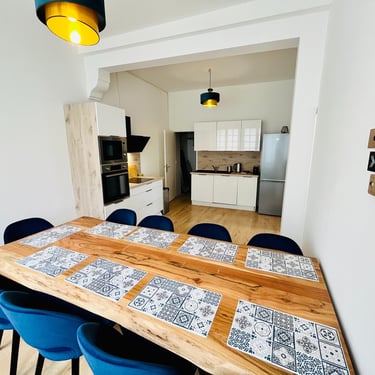 - Un bel espace dinatoire est à votre disposition. Il est composé d'une table en bois brut, avec un piètement industriel, et de chaises contemporaines et confortables. Ici, vous pourrez recevoir vos convives avec élégance !