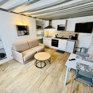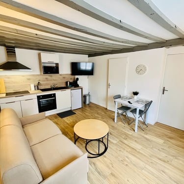 Il comprend un canapé convertible de qualité hôtelière (2 personnes), un espace dinatoire, une belle kitchenette bien équipée.